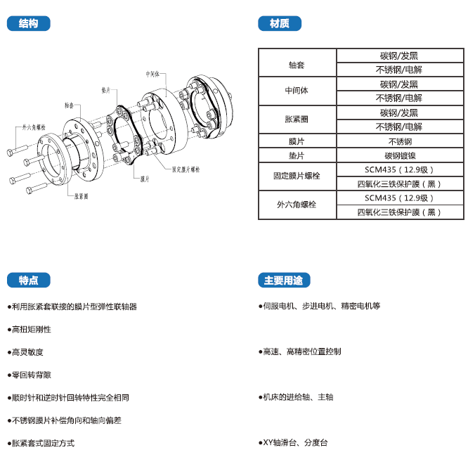 SFPS-T系列聯(lián)軸器采用碳鋼發(fā)黑,利用脹緊套聯(lián)接的膜片型彈性聯(lián)軸器,廣泛用于伺服電機(jī)、步進(jìn)電機(jī)、精密電機(jī)等。